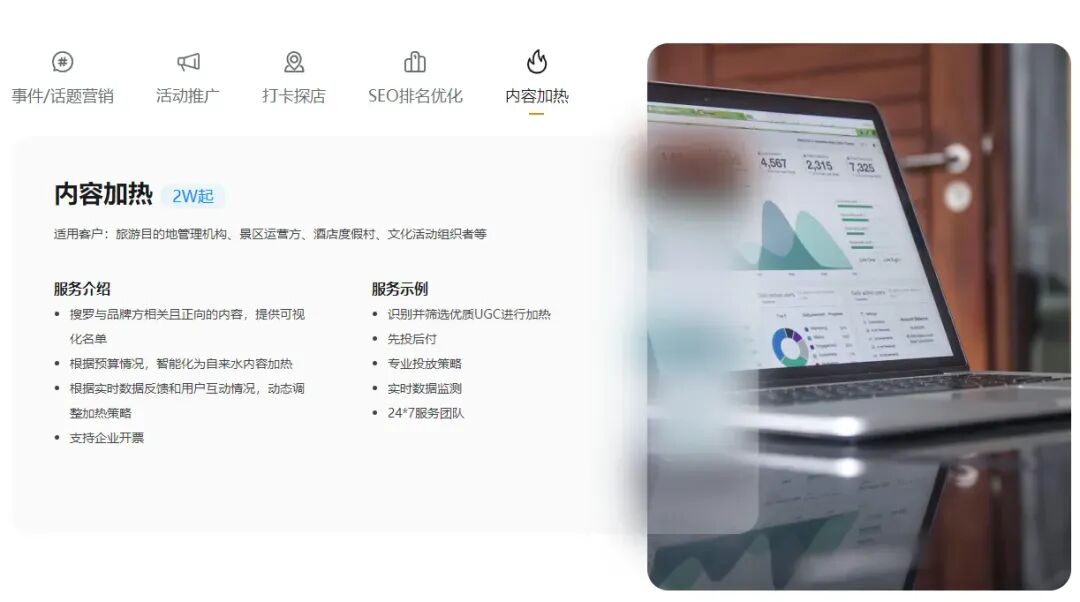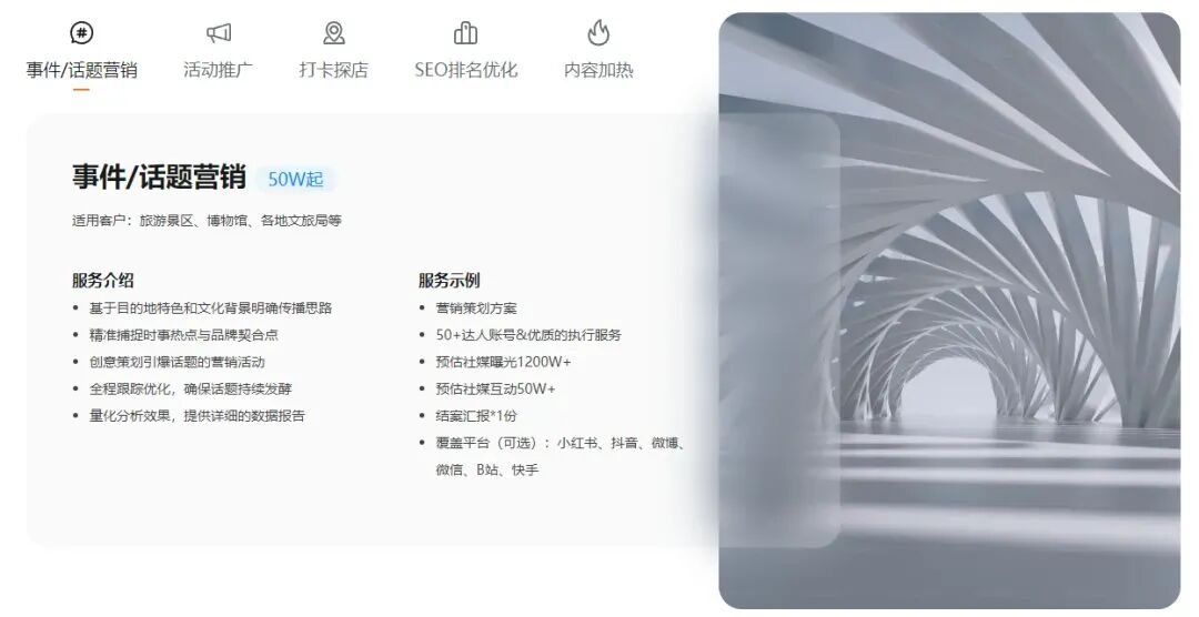 为各大旅游景区、城市品牌等文旅项目提供事件/话题营销、活动推广策划、达人打卡探店、SEO排名优化、内容加热等服务。解决方案:新榜提供专属推广策略,提供事件/话题营销、活动推广、探店打卡等服务。通过对该文旅项目目标客群消费行为分析,针对其自身特点,从实际出发制定差异化社媒推广策略,提供更具创意、效果更优的事件/话题营销及活动推广方案,并根据市场趋势热点不断调整优化推广策略。