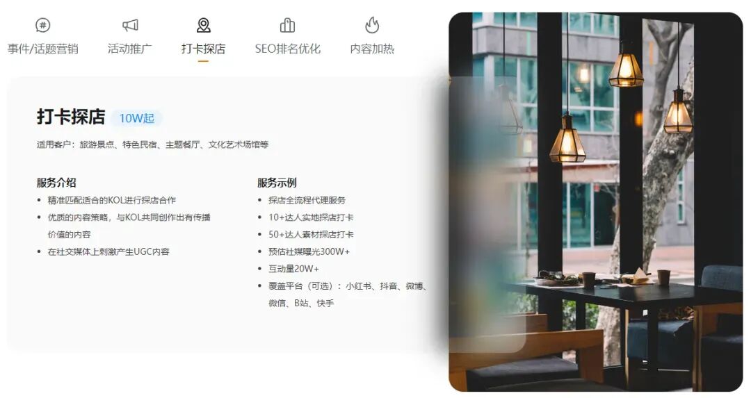 事件/话题营销预估达成1200万+社媒曝光、50万+社媒互动;同时,针对有打卡探店需求的景点、民宿、餐厅、文化艺术场馆,新榜会提供小红书、抖音、微信等6大主流社媒平台探店全流程代理服务,精准匹配适合的KOL进行探店合作。解决方案:新榜提供SEO排名优化、内容加热、IP故事化营销等服务简单来说,新榜提供用户爱搜、常搜以及近期文旅行业及推广项目相关的关键词,通过投放素人/KOC高质量原创笔记来优化该文旅项目的搜索排名,以此获得持续性曝光和流量,提高景区知名度和用户信任度。在社交媒体上消费者的有感而发更容易获得其他用户的信任,新榜智能化识别并筛选出具有爆文潜质的真实内容进行加热,放大优质内容,增强用户口碑影响力。
