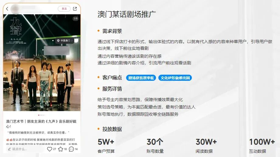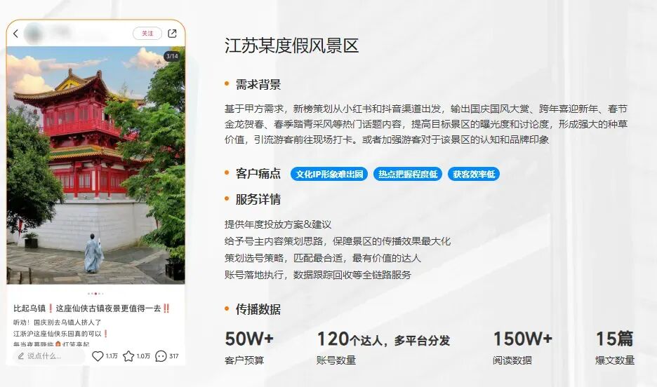 客户痛点:文化IP形象难出圈、热点把握程度低、获客效率低服务详情:提供年度投放方案及建议;给予号主内容策划思路;策划选号策略,匹配优质达人;执行投放并回收数据服务详情:给予号主内容策划思路;策划选号策略,匹配优质达人;执行投放并回收数据数据亮点:仅用5万预算达成,全网阅读数据30万+,总互动100万+新榜文旅新媒体推广优势