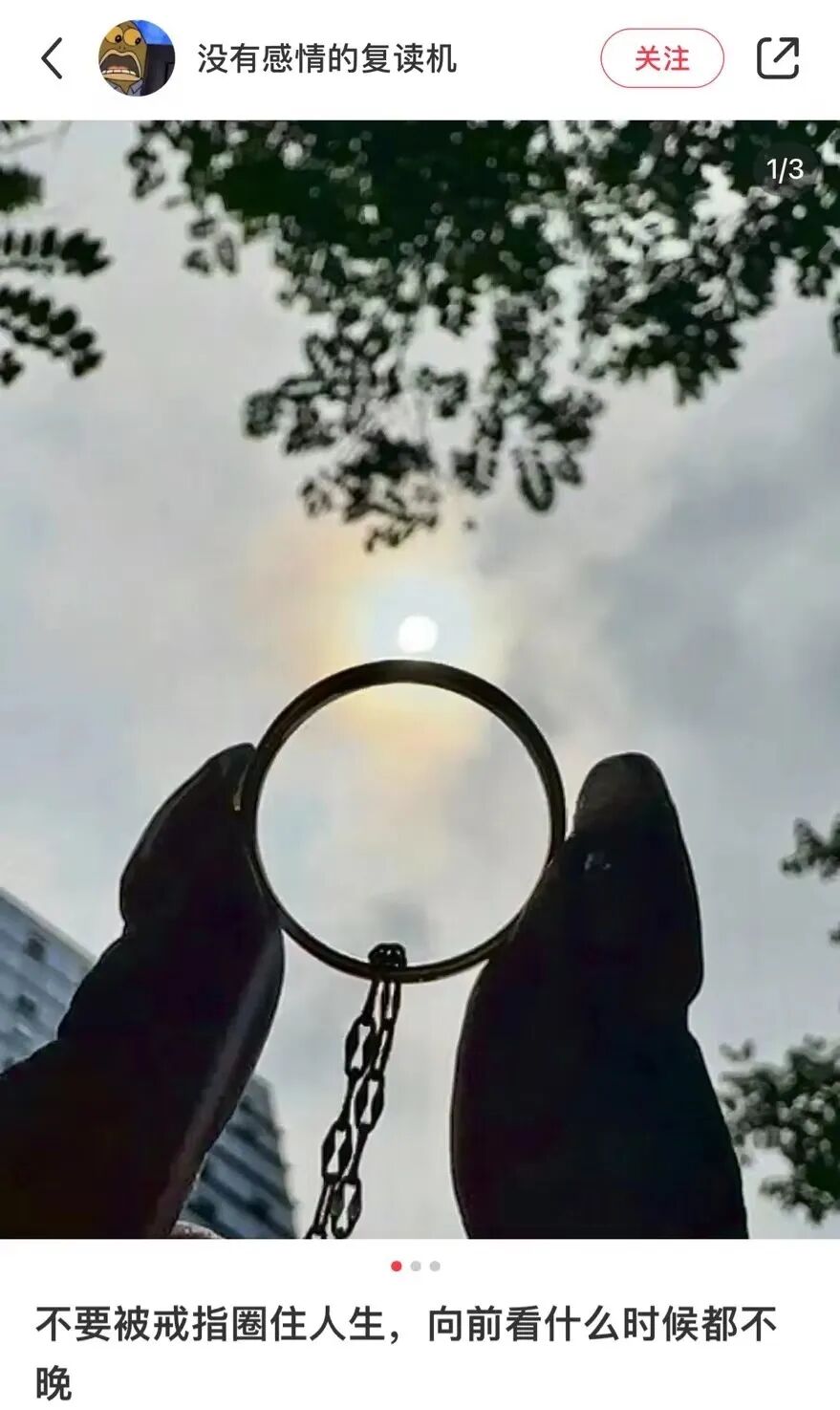 在@甸甸 心中,摘下这枚戒指代表着母亲的新生,而寻到这枚戒指的@没有感情的复读机 则更坚定了自己选择的道路:不要被戒指圈住人生,向前看,什么时候都不晚。