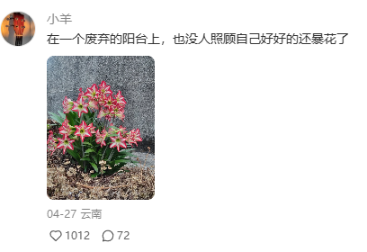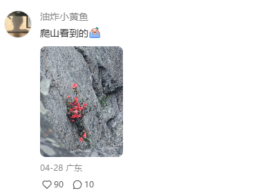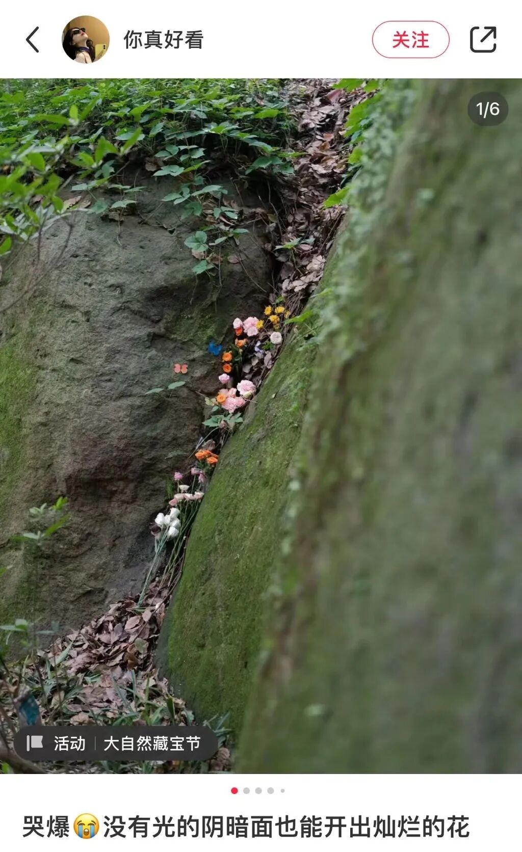宝石山背光的夹缝里,@你真好看 看到了灿烂盛开的花,”帮它清理了一下四周的垃圾。能和一群素未谋面的陌生人一起接力守护这个大自然的小角落,感觉真的好奇妙呀!”
