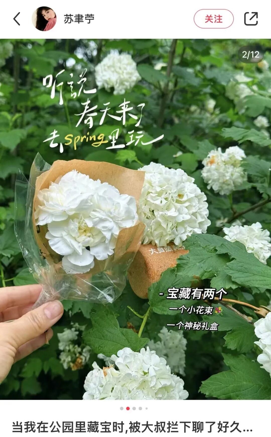 @苏聿苧 自己做了一捧小花束,藏在了花丛间,和这捧花一起传递给寻宝者的,是她在藏宝时,路人大叔的感慨:小年轻的活动真有趣!
