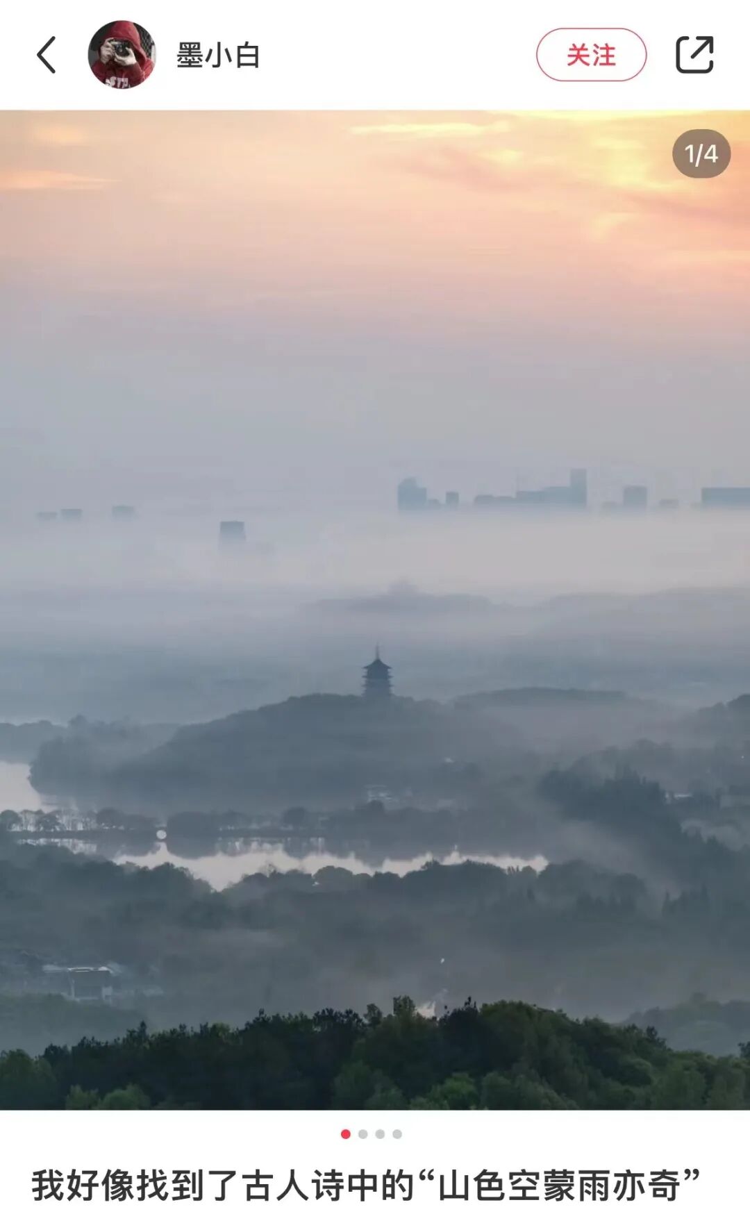 日出之前,@墨小白 赶到了@Lonelyegg 在南高峰埋下的藏宝点。此刻,一幅“山色空蒙雨亦奇”的画卷在眼前展开。