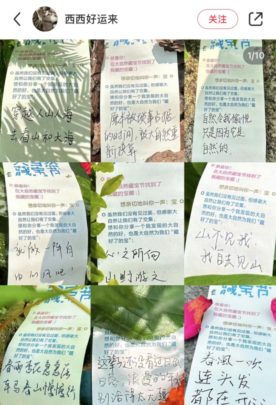 相似的快乐还有很多,比如同样热爱自然的人,在藏宝纸条上写下掏心掏肺的自然感悟。
