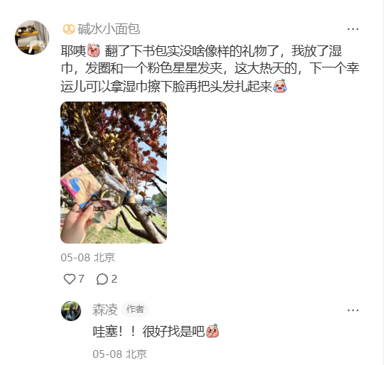 @碱水小面包 找到宝藏后,贴心地为下一位寻宝人准备了湿巾、发圈、粉色星星发夹,她说:“大热天的,下一个幸运儿可以拿湿巾擦下脸再把头发扎起来”。哈特软软!