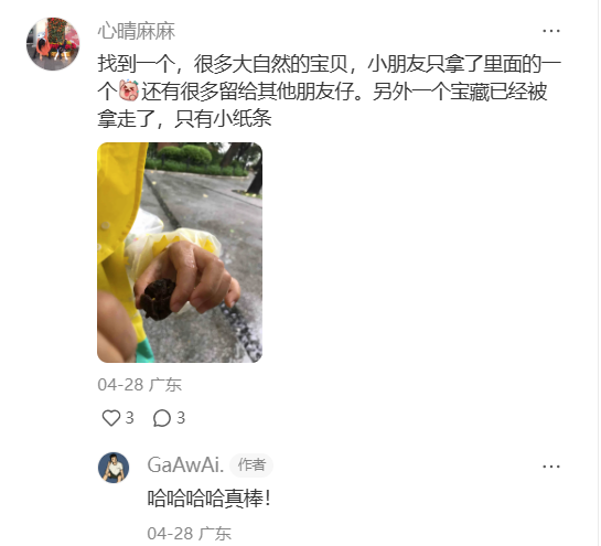 @奶糕ggw 去深圳湾找宝物,在清洁工阿姨的带领下,找到了藏宝官留下的贴心纸条;@今天自我反省了吗 的耳机离家出走,结果被人用漂亮发带小心翼翼地包着放在了藏宝点。