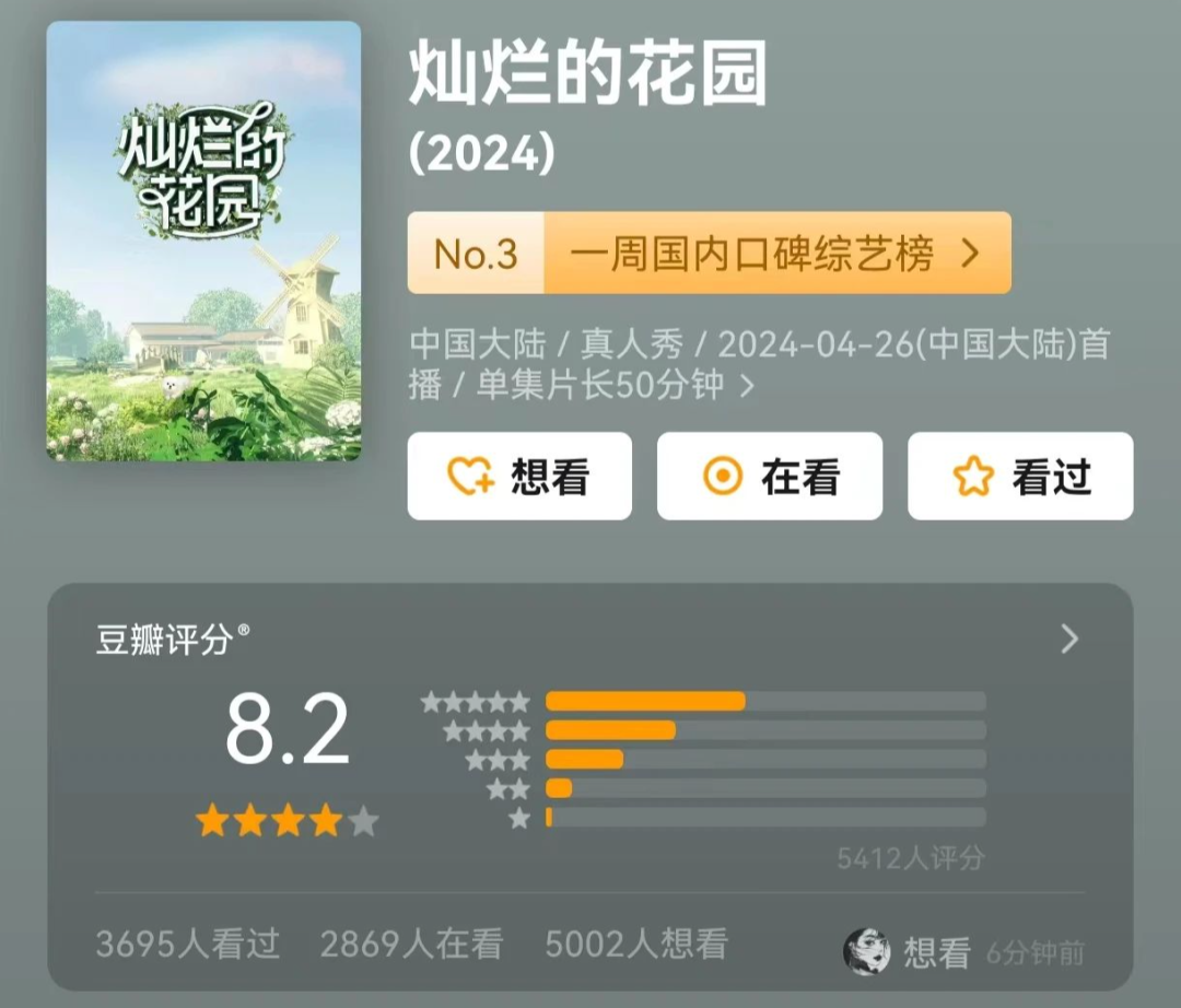 不同的讨论声之下,四期过后,《灿烂的花园》拿下豆瓣8.2分,与此同时,综艺市场从五月开始进入白热化竞争状态,再加上长视频两大头部IP《歌手2024》与《庆余年2》对撞攫取大盘,整体氛围平和、松弛的《灿烂的花园》在播放数据、话题讨论度方面仍需更多“柴火”。