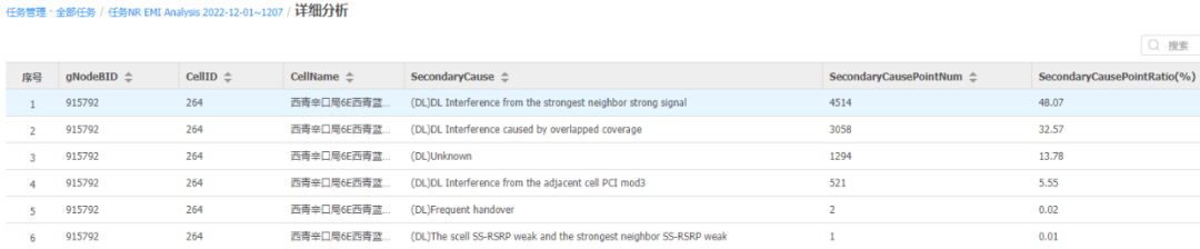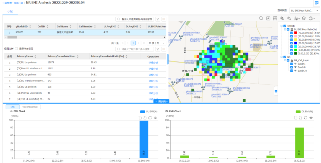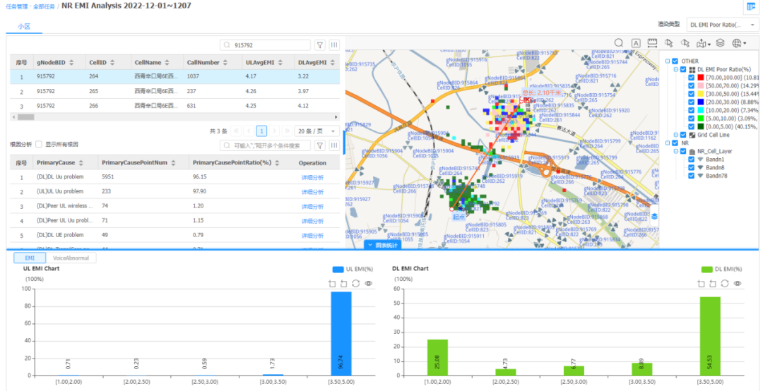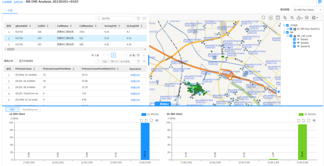 问题现象:915792-264小区上行EMI均值为4.17,下行EMI均值为3.22,下行EMI质差采样点占比为35.85%。该小区存在严重的VoNR语音下行质差问题,且下行质差栅格规律分布,小区近点覆盖区域VoNR语音感知良好,远点覆盖区域VoNR语音感知较差,质差占比超过20%的区域主要汇聚在距离服务小区1.8公里的区域。下行EMI质差根因定界为DL Uu problem,根因定位原因值主要为DL Interference from the strongest neighbor strong signal、DL Interference caused by overlapped coverage,如下图所示。
