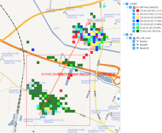 问题分析:从现象上看,该问题的主要原因是越区覆盖干扰导致的下行质差问题。质差区域由915835-263小区进行主覆盖即可,915792-264小区对该区域形成了越区覆盖干扰,如下图所示。