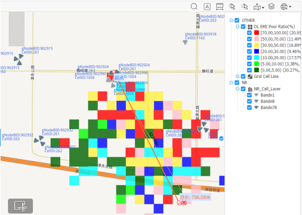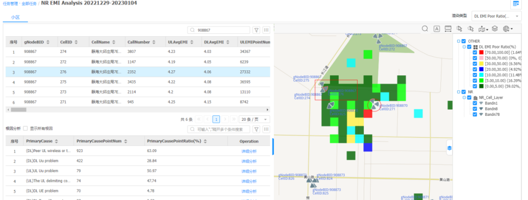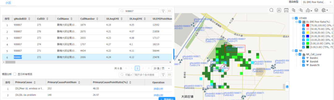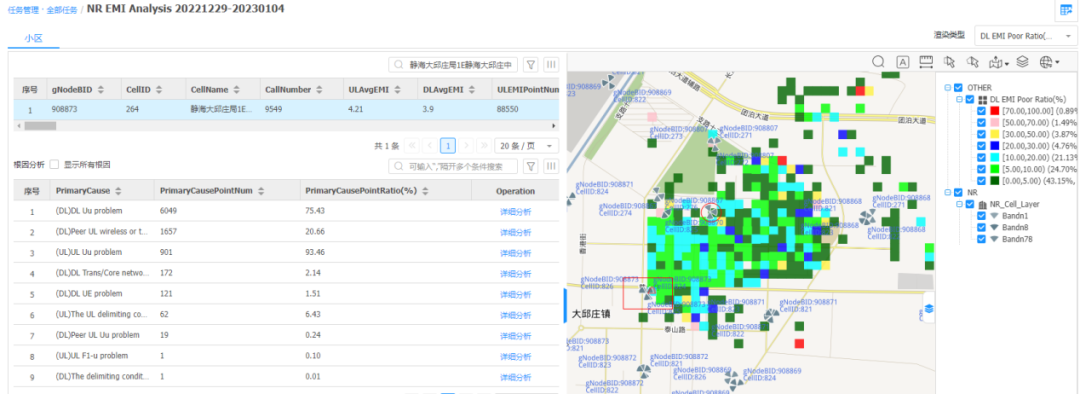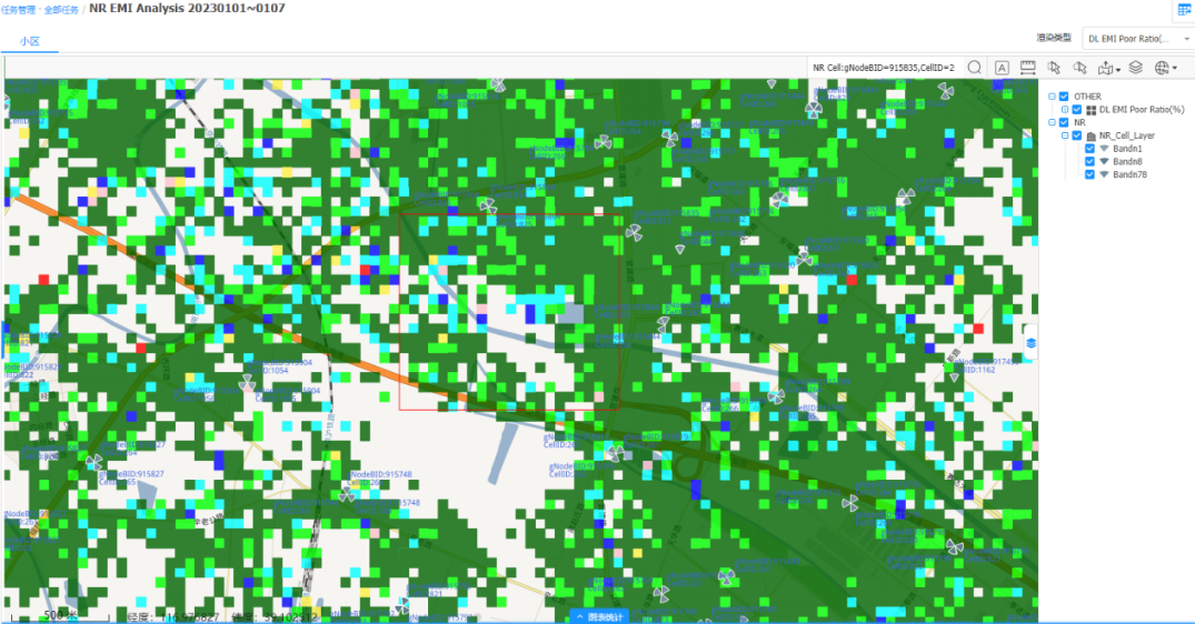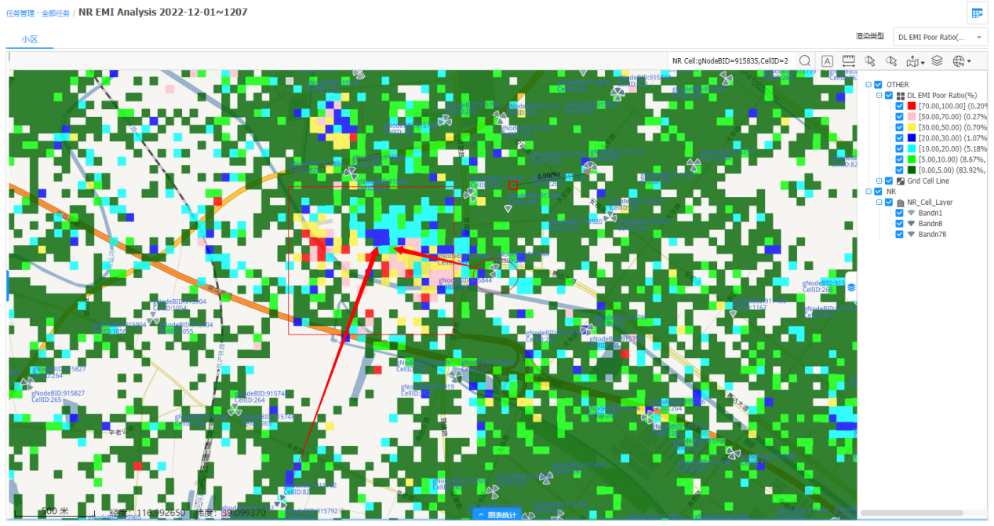 问题现象:908870-272小区上行EMI均值为4.23,上行EMI质差占比为0.56%,下行EMI均值为3.84,下行EMI质差占比为11.91%。存在中度VoNR语音下行质差问题,质差栅格主要分布于覆盖区域左侧。下行EMI质差根因定界为DL Uu problem,根因定位原因值主要为unknown、DL Interference from the strongest neighbor strong signal、DL Interference caused by overlapped coverage,如下图所示。