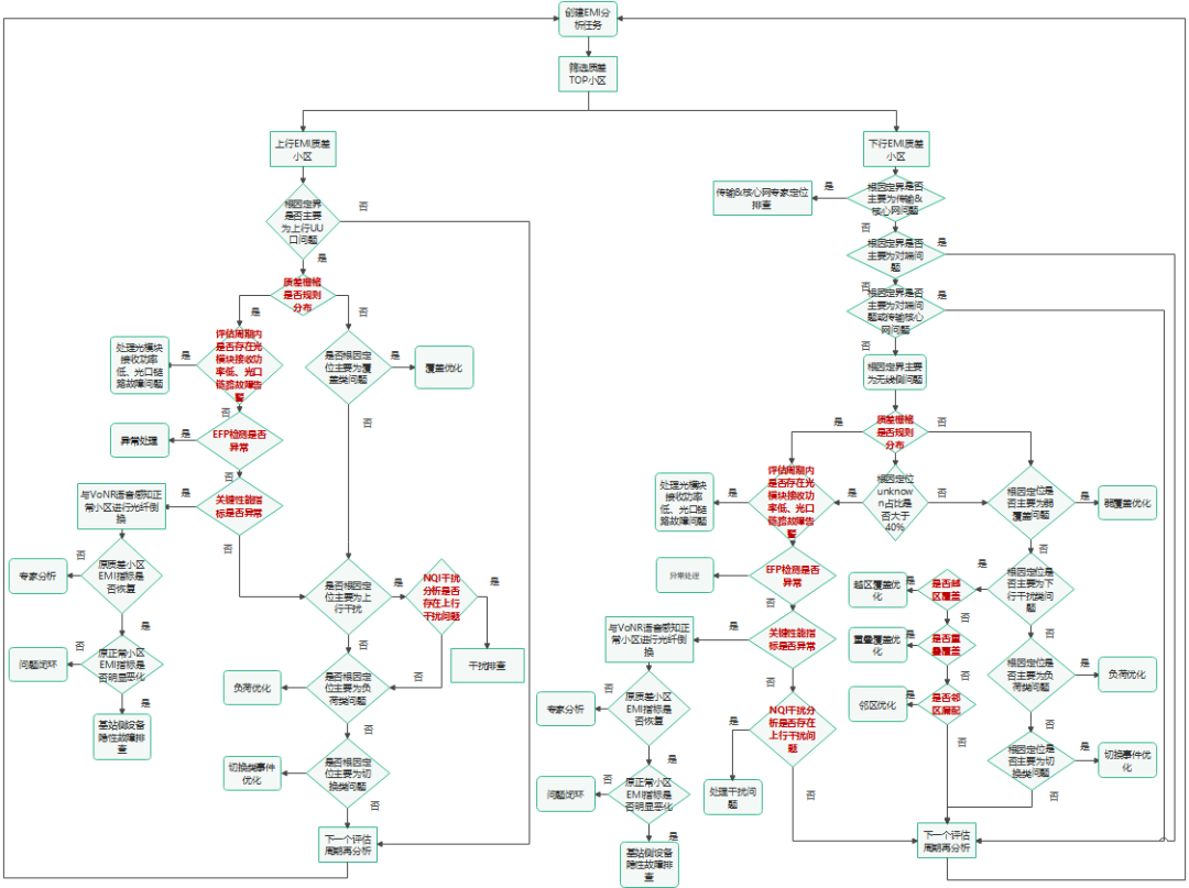 基于NGI VoNR EMI工具的VoNR语音质差小区优化方法的工作流程如下图所示(红色部分需要人工进行判断)。