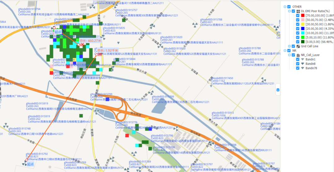 EMI质差栅格规律分布,质差栅格聚合在局部。