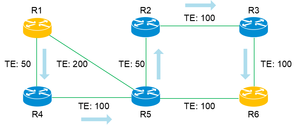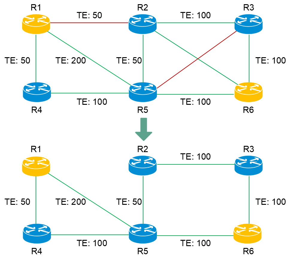 - R1与R2之间的链路亲和属性为红色,R3与R5之间的链路亲和属性也为红色,因此R1与R2之间的链路、R3与R5之间的链路都被排除。