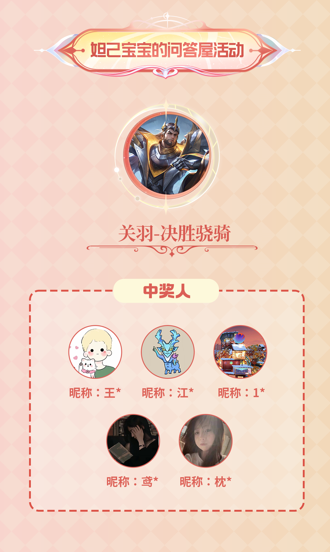 恭喜以下用户参与“妲己宝宝的问答屋活动”中奖,妲己宝宝将在公众号后台私信大家填写相关领奖信息,请于5月28日23:59前填写,逾期视为放弃领奖,奖励会在60个工作日内发放,请务必耐心等待哦~