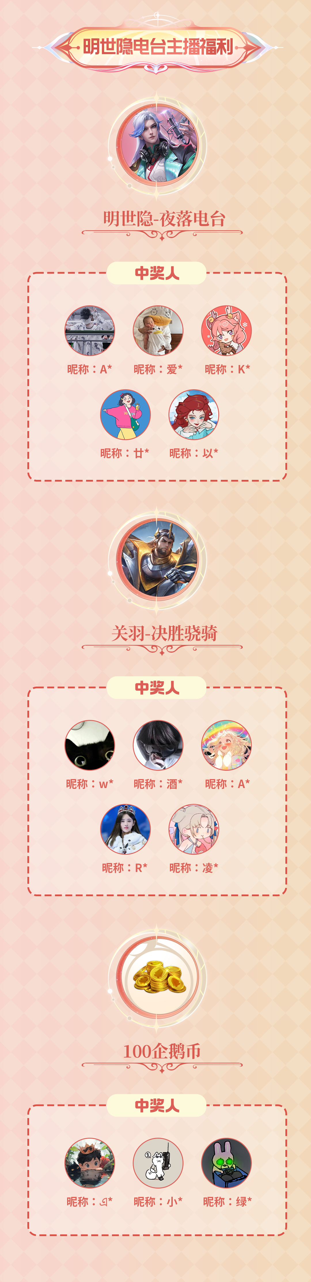 恭喜以下用户参与“明世隐电台主播福利”中奖,妲己宝宝将在公众号后台私信大家填写相关领奖信息,请于5月28日23:59前填写,逾期视为放弃领奖,奖励会在60个工作日内发放,请务必耐心等待哦~