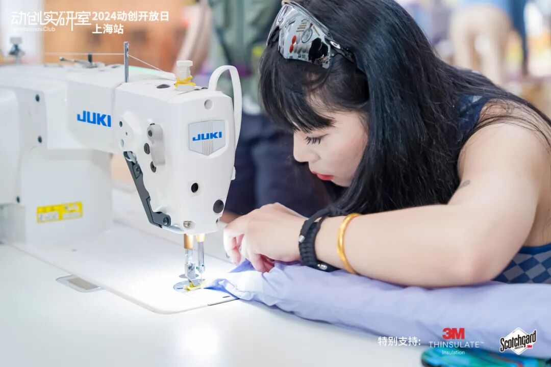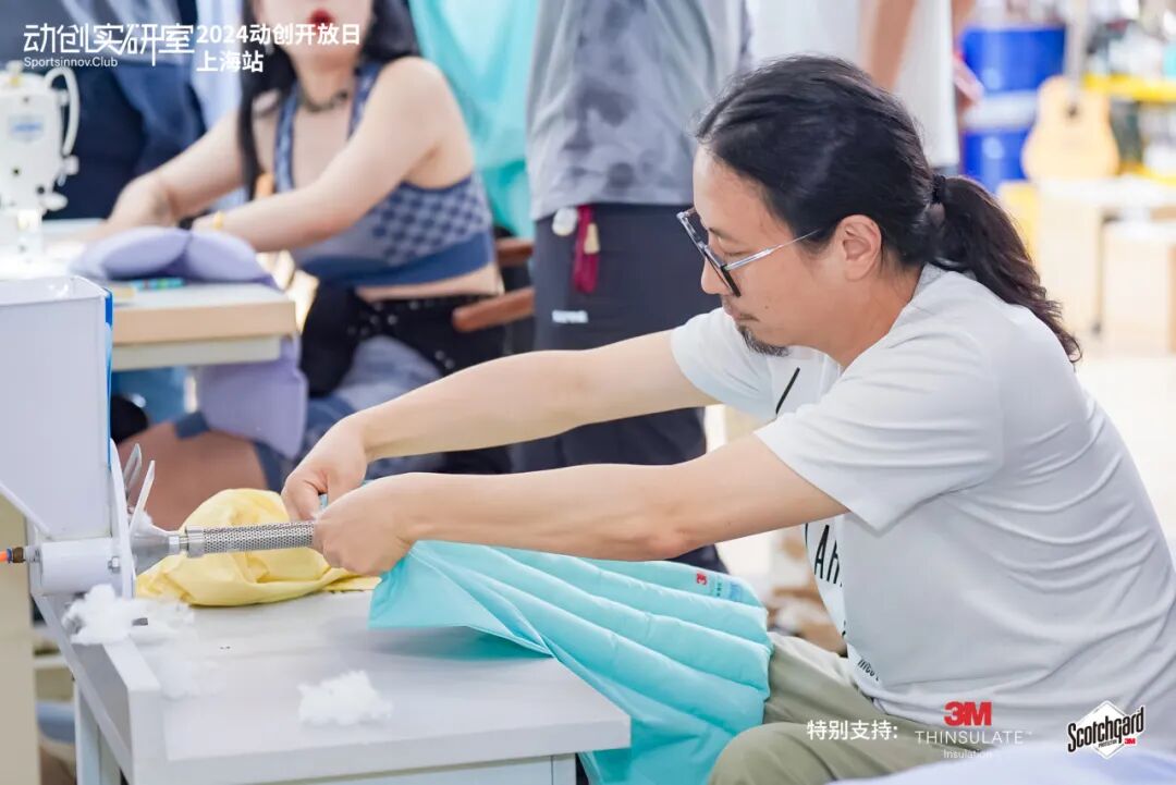 现场,大家采用3M™新雪丽™云纤保暖材料和3M™思高洁™功能保护助剂,使用充棉机和缝纫机做一款防泼水靠枕,在可持续的氛围中拥有一个良好的3M™新雪丽™材料充棉体验,重温了一把大学时期的"缝纫课”。(居然可以自动充棉,太高效了~)