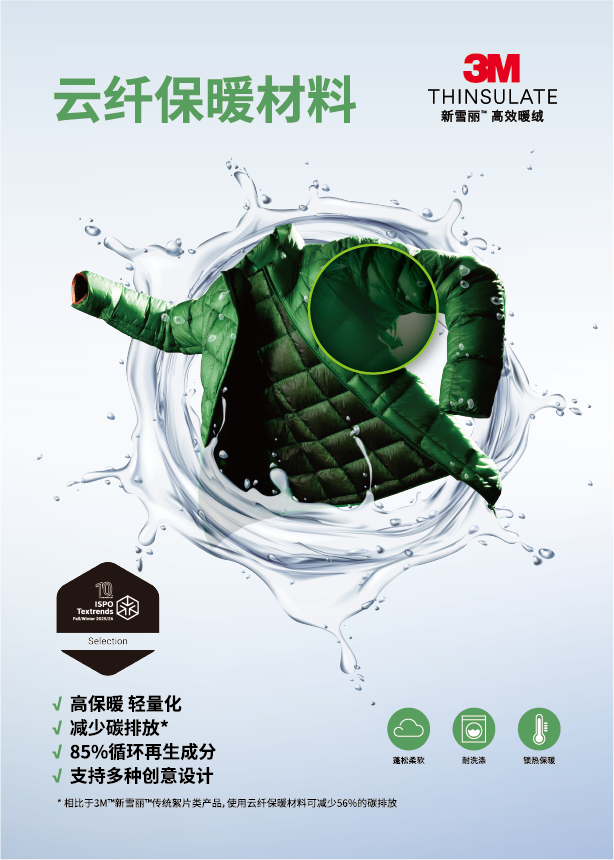 3M™新雪丽™保暖材料致力于营造更美好的环境和未来,全新升级的3M™新雪丽™云纤保暖材料是一款新型Featherless保暖材料。
