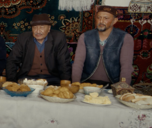 △剧中阿勒泰人家的茶几上,摆满了包尔萨克等各类食物招待客人。
