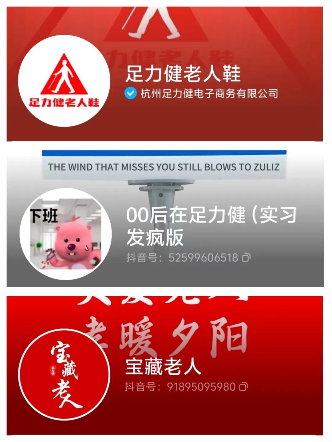 抖音上我们有多个品牌号,一个是足力健老人鞋,一个是00后在足力健,一个是宝藏老人,面向不同的人群做内容。