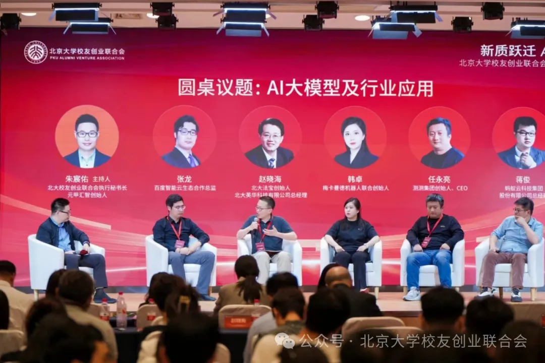 “AI大模型及行业应用”主题圆桌论坛由北大校友创业联合会执行秘书长、元甲汇智创始人朱宸佑主持,邀请百度智能云生态合作总监张龙、北大法宝创始人兼北大英华科技有限公司总经理赵晓海、梅卡曼德机器人联合创始人韩卓、测测集团创始人兼CEO任永亮,以及蚂蚁云科技集团股份有限公司总经理蒋俊,分享个人经验和专业见解,为参会人员打开AI大模型行业应用的全新视角,带来一场思想的碰撞和交流的盛宴。