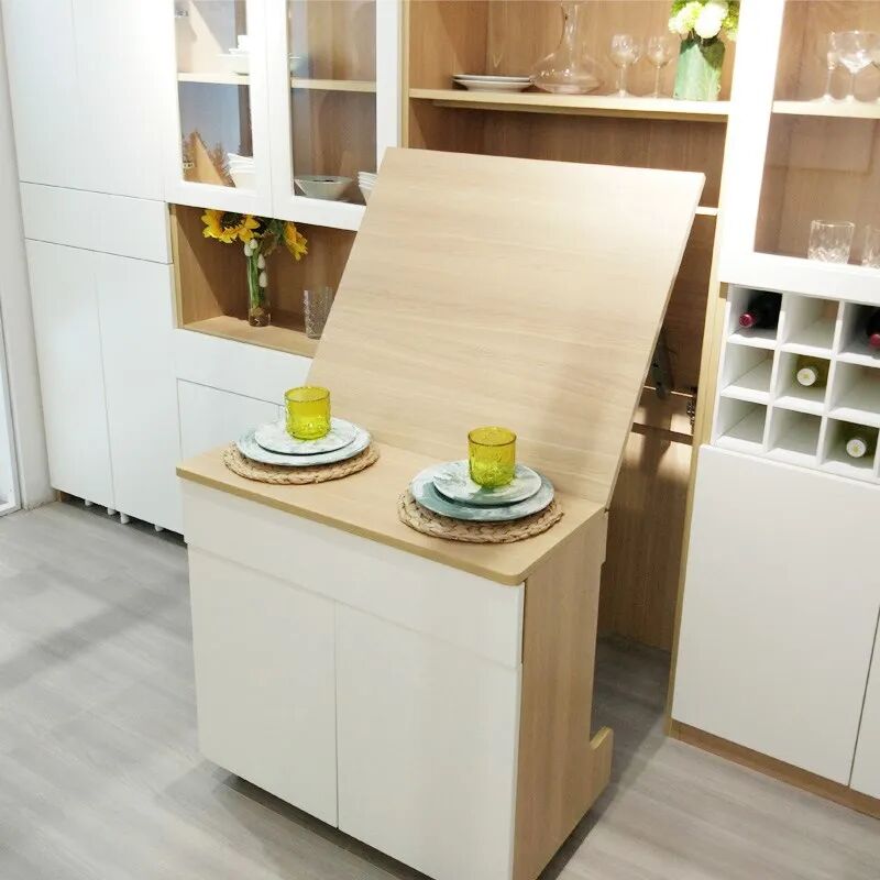 利用橱柜隐藏一个可以抽拉的桌板,用来满足台面的延伸,甚至可以满足一两人的就餐功能!这一设计简直是小户型节省空间的利器!