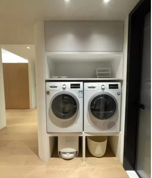 如果你家空间有限,那么抬高洗烘机是增加存储空间的一个好办法,背后预留下水电源,下方也可以满足一个存物的位置,在这下面放上一些收纳盒平时放置一些即将换洗的衣物非常合适!