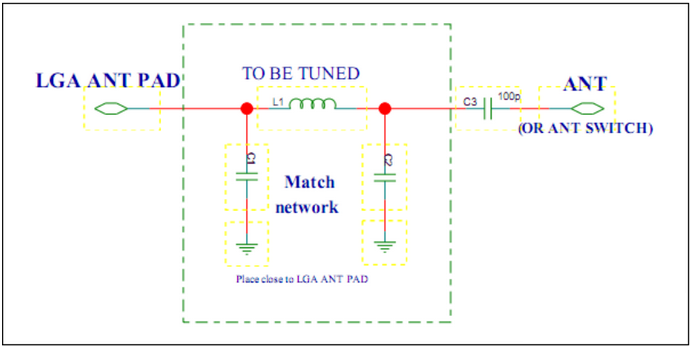 匹配网络中电容电感符号只是示意图, C1, L1 和 C2 的值要通过阻抗匹配调试来确定, 既可能是电容也可能是电感,当然也可能不用焊上器件( NC)。