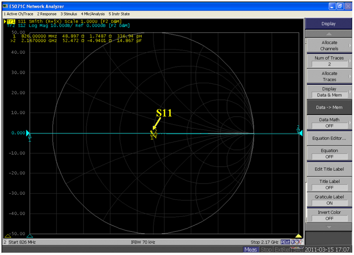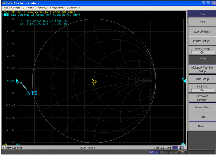 将 S11 参数在所用频带内收敛于 SMITH 圆图圆心(50 ohm)后,匹配已调试完毕,此时测量所用频点的 S12 值,作为线损补偿。测量 S12 时,显示模式最好选用幅值的对数模式 Log Mag 来读值,如图 4-3 所示。一般情况下选所用频带的中信道频点的S12 值作为插损。
