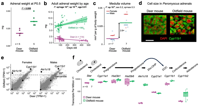 事实证明,这两种小鼠的肾上腺大小差异惊人。成年后,一夫一妻制小鼠的肾上腺大约是滥交小鼠的六倍(在调整了物种间体重的差异后)。Bendesky博士说,“这些近亲物种之间内脏器官大小的巨大差异是前所未有的。”