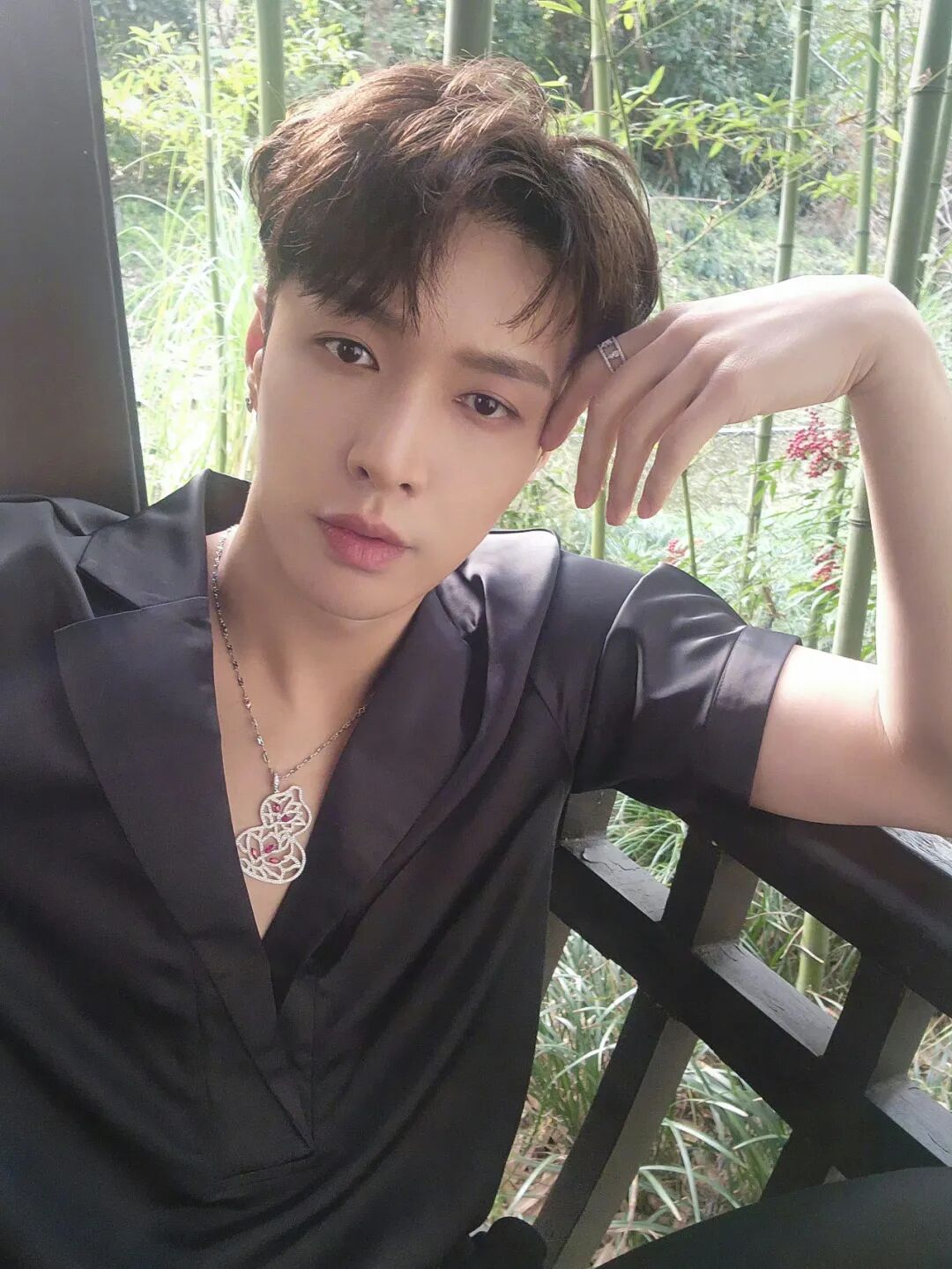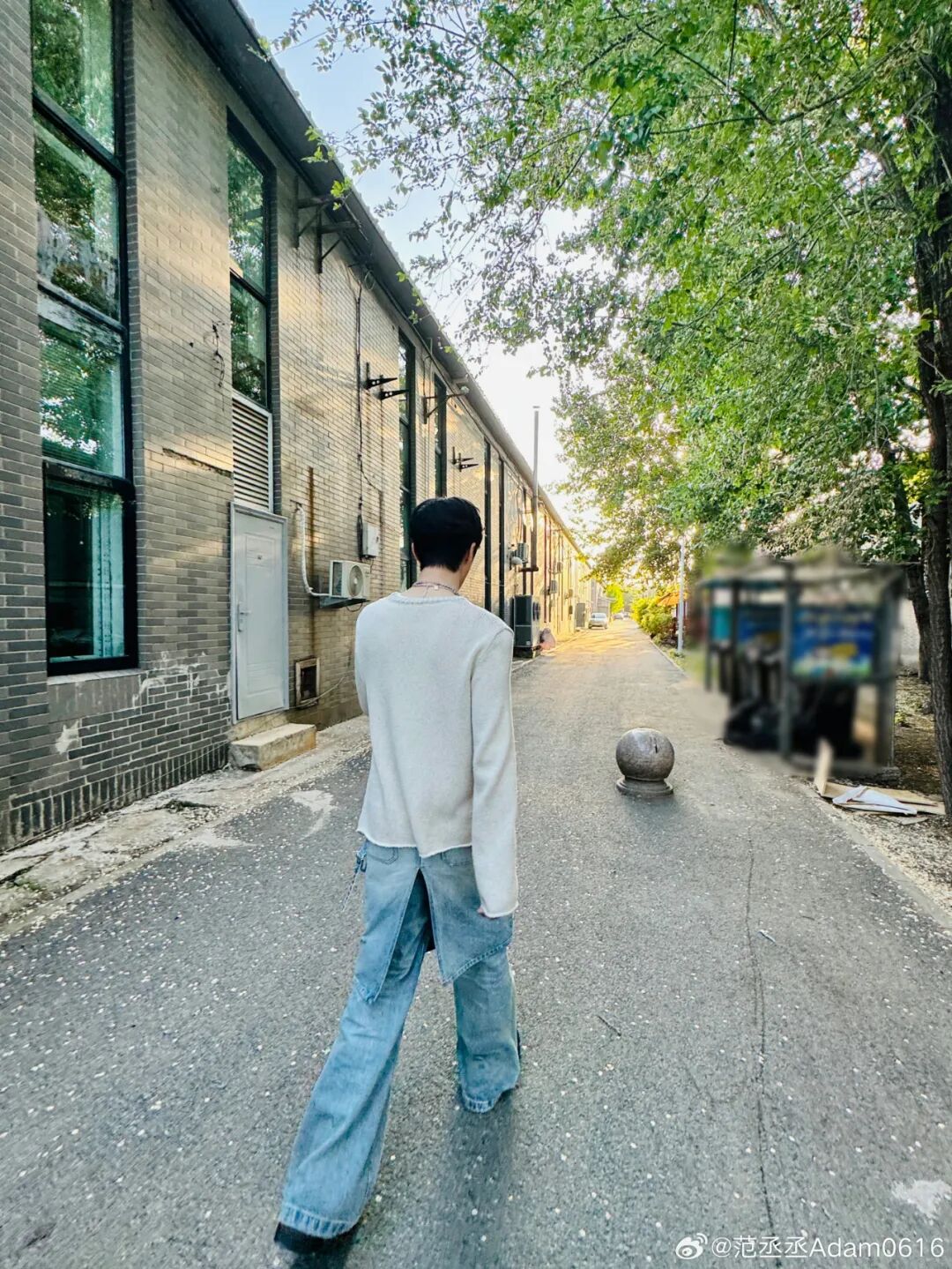 范丞丞的阔腿裤造型更加特别,设计感前片包裹式阔腿裤,搭配垂坠感上衣,走路式拍照法更是把腿悄悄拉长了。