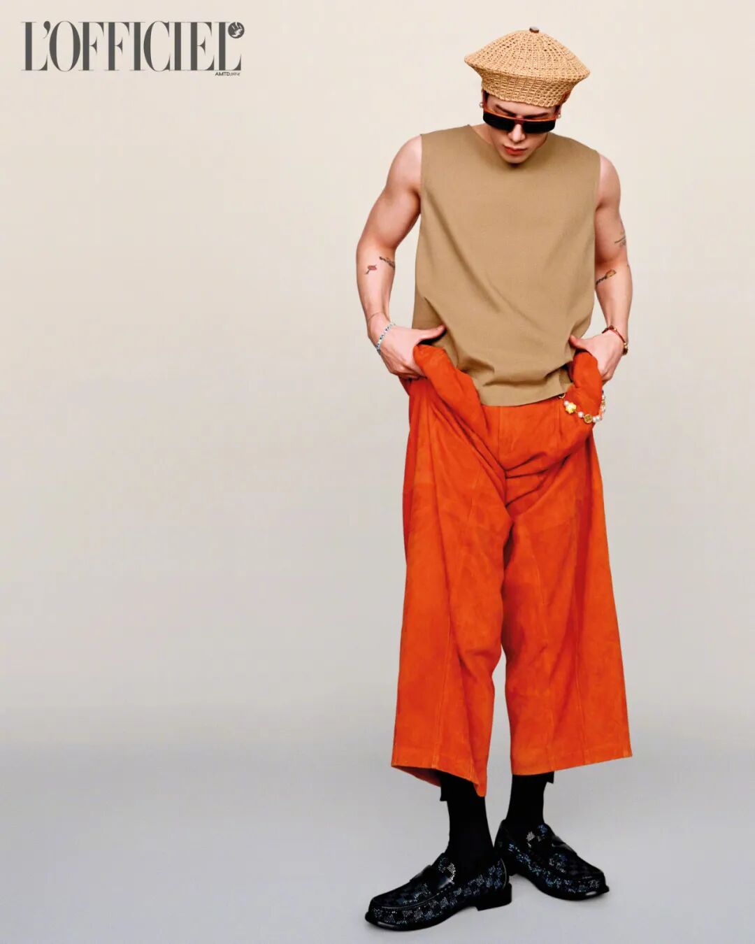 除了基础款的黑白色,彩色也是夏季主旋律。王嘉尔的驼色坎肩背心搭配亮橙色阔腿裤,呼应夏季限定草编元素帽子,带来热浪满满的夏日气息。