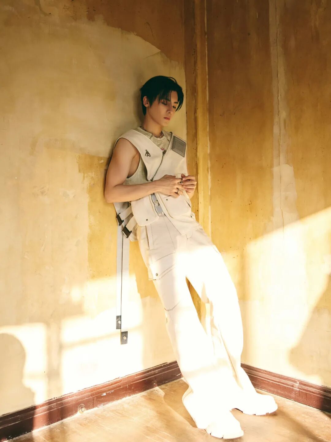 将背心玩出机能风,只需要多穿一件马甲。搭配同色工装裤和厚底鞋,不同层次的白色带来清爽的视觉体验。