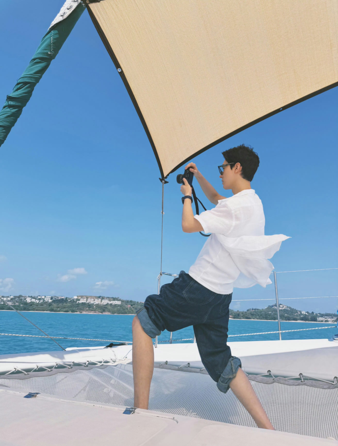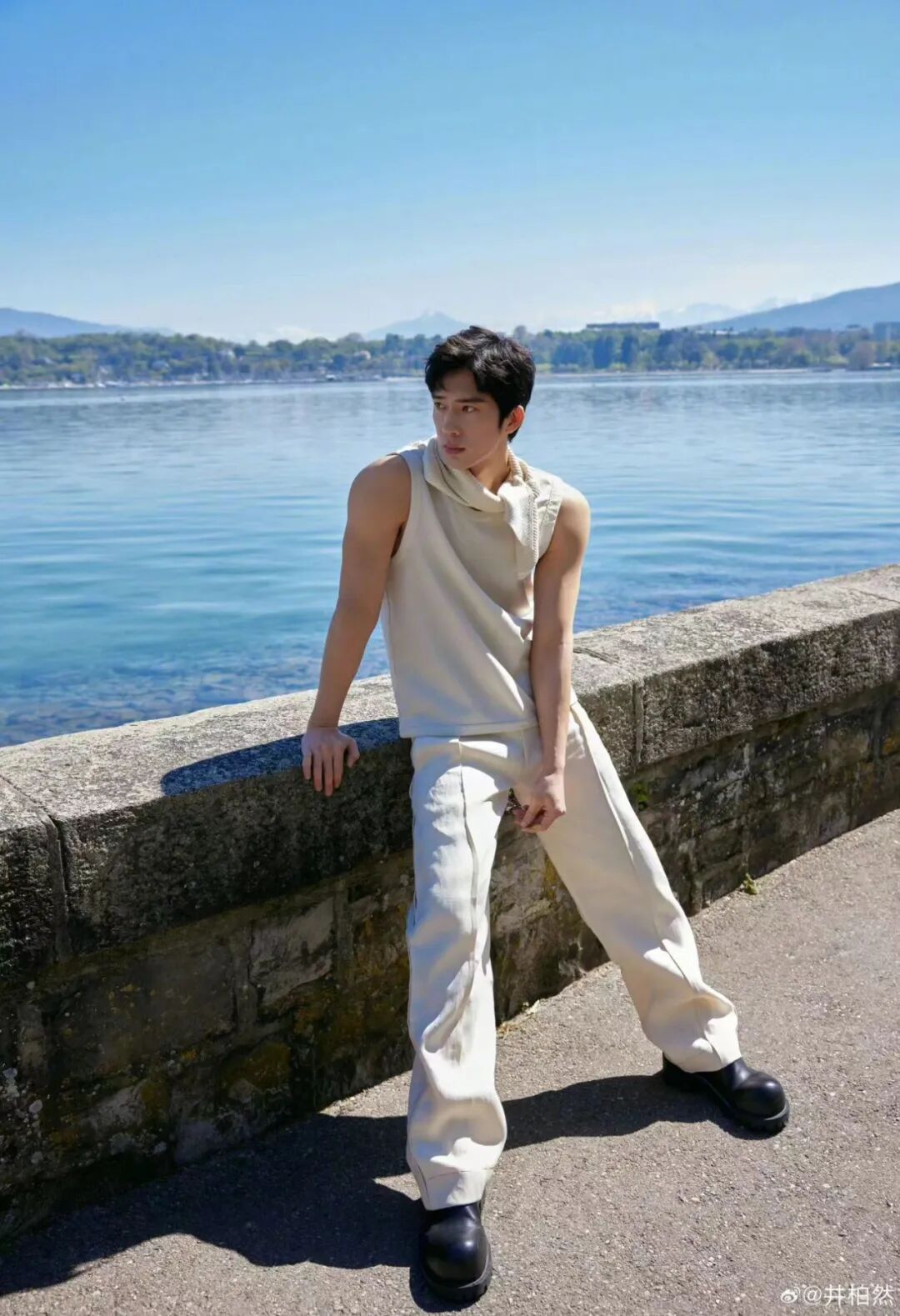 如果觉得基础穿搭不够“玩味”,就把配饰“搬”出来。除了各种项链、手链以外,还可以参考井柏然的海边浅色穿搭,佩戴同色丝巾,丰富穿搭的层次感。