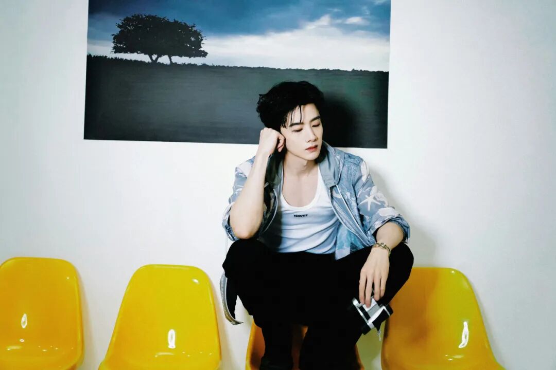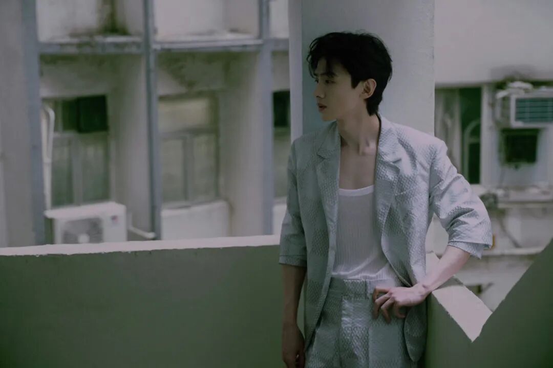 白敬亭的基础款背心与清爽蓝色外套的组合搭配黑色西装裤,领口稍低的内搭,更能拿捏不经意间的时尚感。