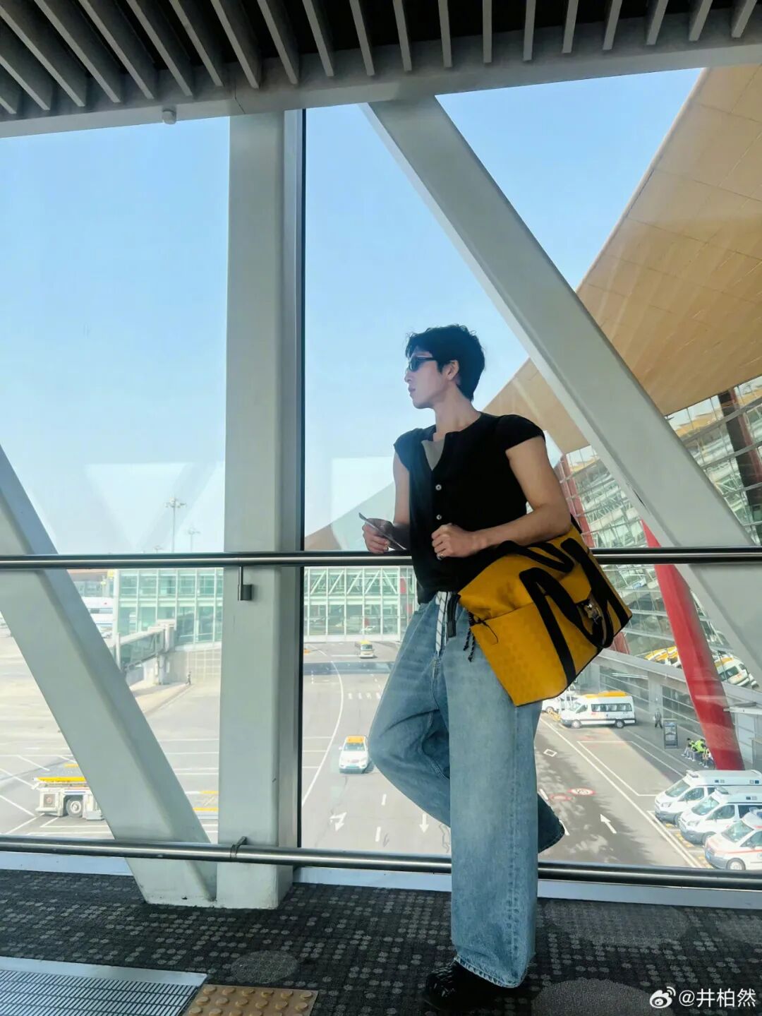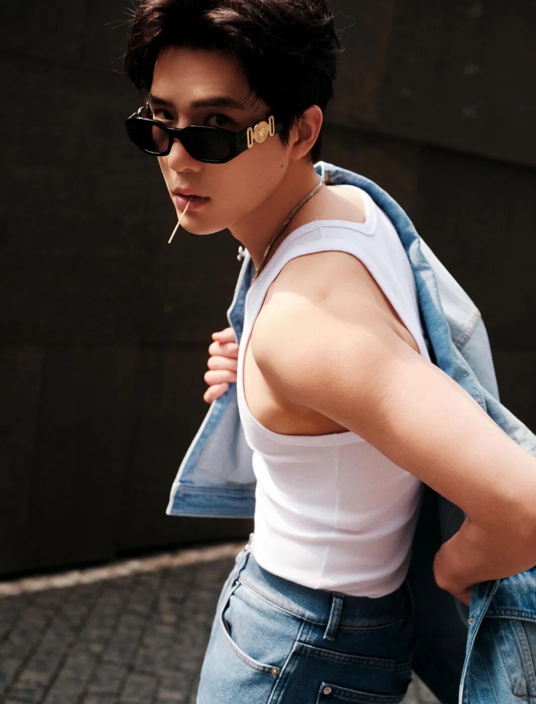 更进阶的时髦教程,还有近期火出圈的 baggy jeans 穿搭,主打用阔腿裤修饰腿形。井柏然的小飞袖背心搭配蓝色牛仔裤,高腰的设计将身材比例完美修饰,背大包显瘦同样适用于男生。