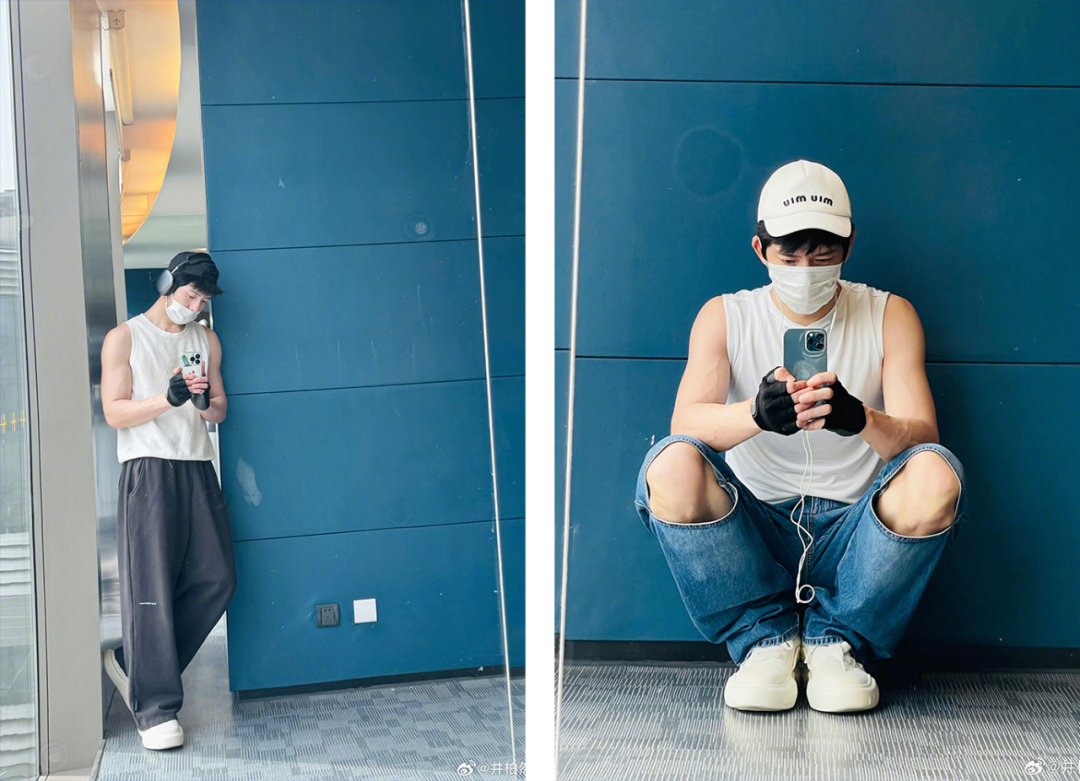 井柏然也经常发布自己的的健身房“大片”。他与白敬亭的“相爱相杀”,体现在“斗嘴”和“卷穿搭”上。一件背心搭多件裤子,轻松穿出夏日清爽感。