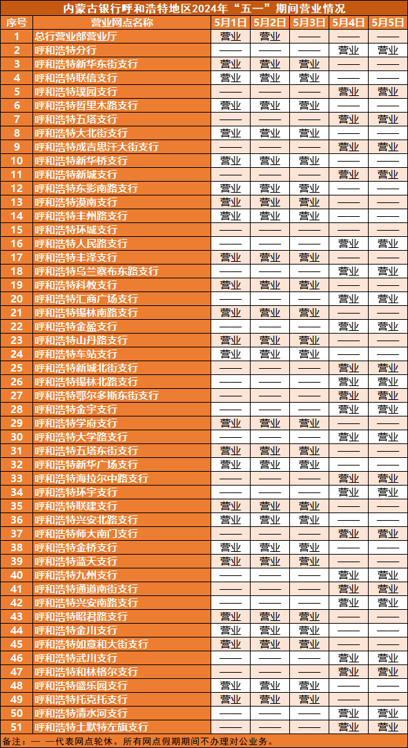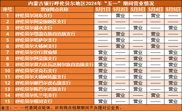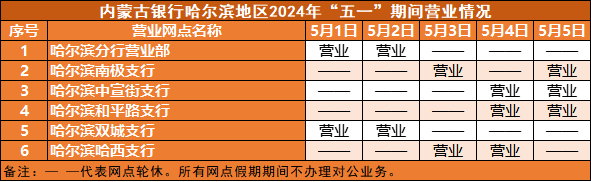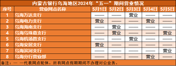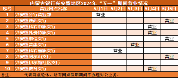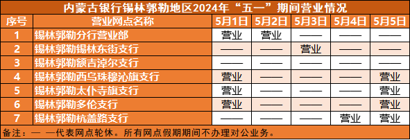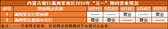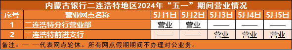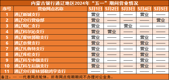 根据《国务院办公厅关于2024年部分节假日安排的通知》,结合我行实际情况,现将"五一"假期(2024年5月1日—5月5日)营业网点营业时间安排予以公告,营业期间只办理个人业务。