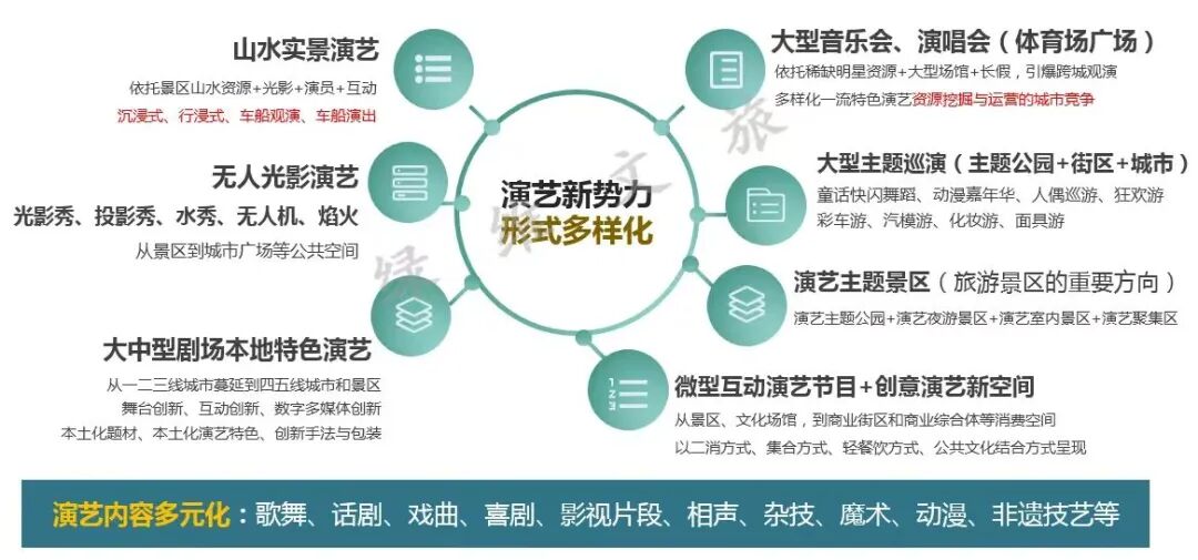 2023比2019年增长125% ;实景、光影、魔术、喜剧、话剧、戏曲、歌舞、民族、无人机、烟花等;