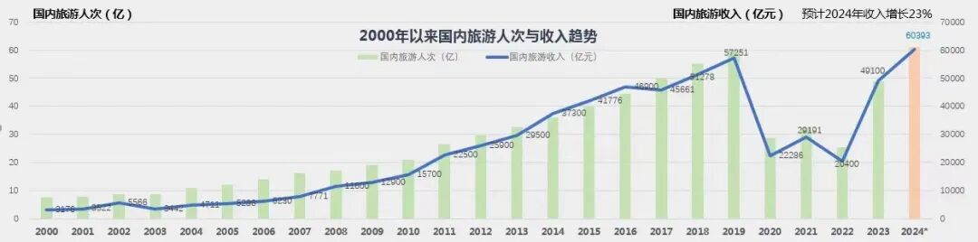 2023年、2024年文旅行业处于恢复性增长区间。对比2019年,国内旅游人次与收入形成了一个“N”字发展曲线。在整体旅游逐步恢复的同时,“城市打卡风潮”“博物馆旅游” “旅拍热”“演艺引爆城市”等新特点出现,市场表现出勃勃生机。这些新变化、新势力表征着文旅融合新时代的到来。