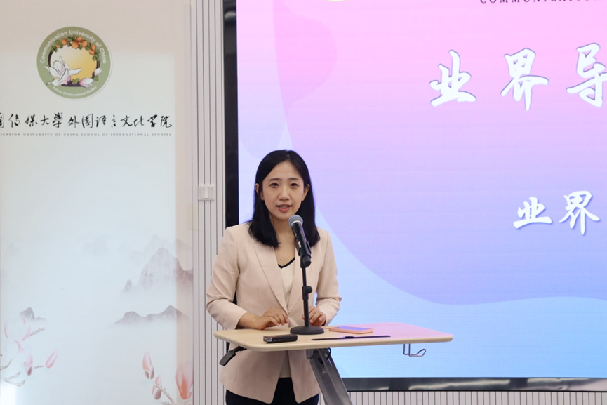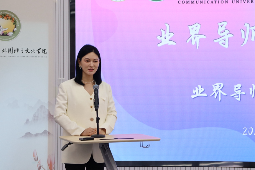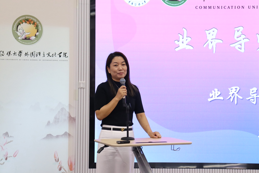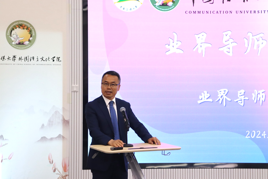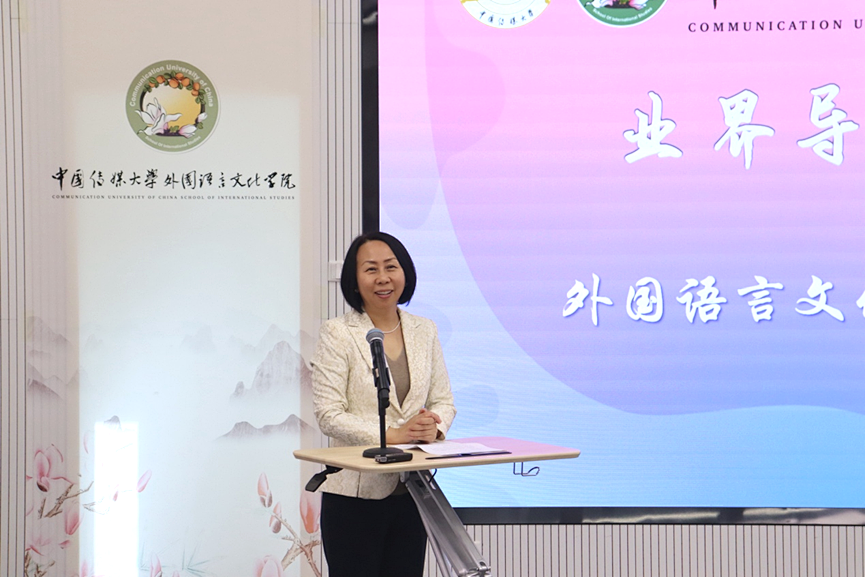 中国传媒大学外国语言文化学院党委副书记、院长文春英在致辞中对业界导师表示衷心感谢,提议产学研各界共同努力培养新时代的传媒人。文院长指出,大学教育不应闭门造车,需要开门办学,建立校企合作平台,实现学界与业界的无缝衔接。业界导师将深度参与教学和实践,为学生提供个性化指导,培养“复语、复合、复能”的国际传播人才。