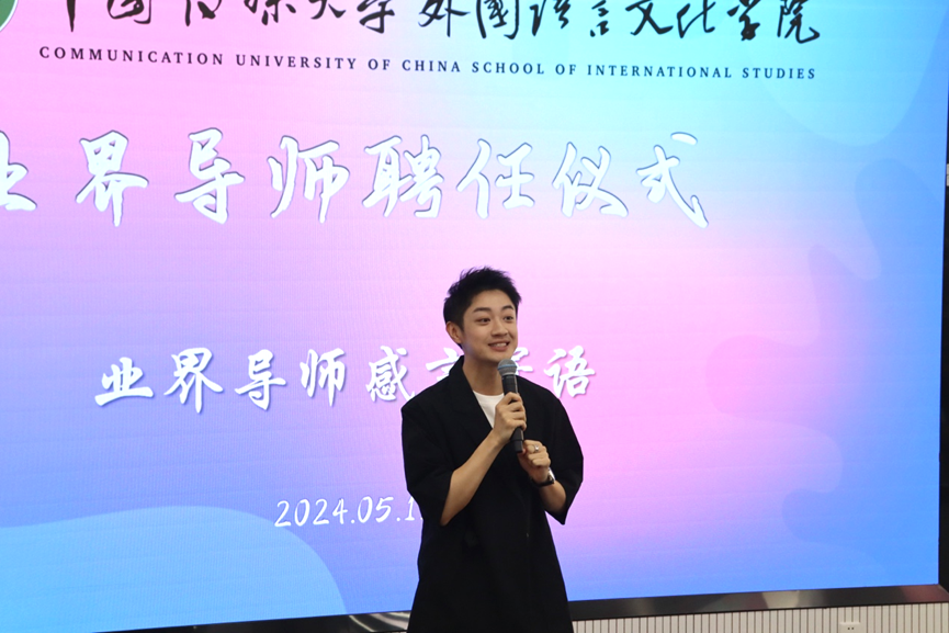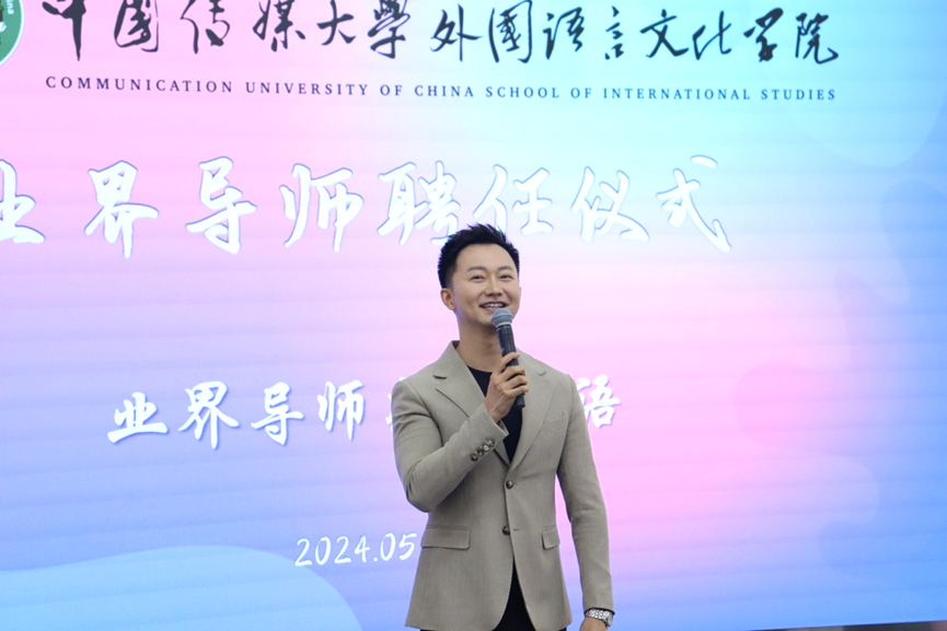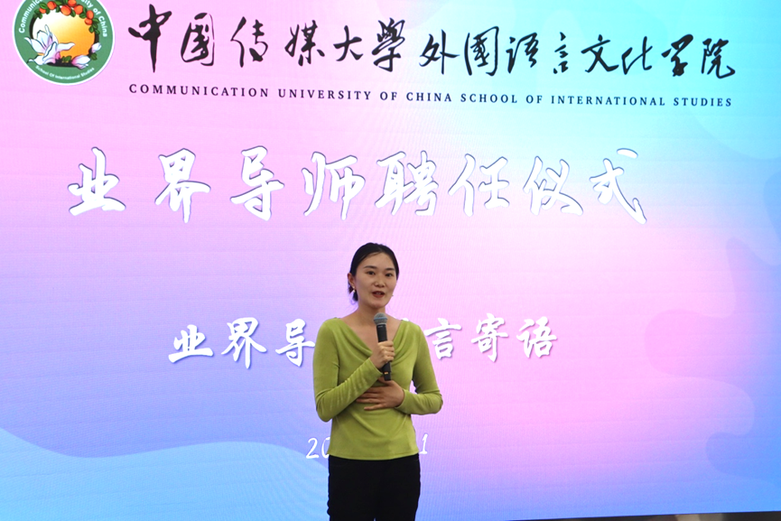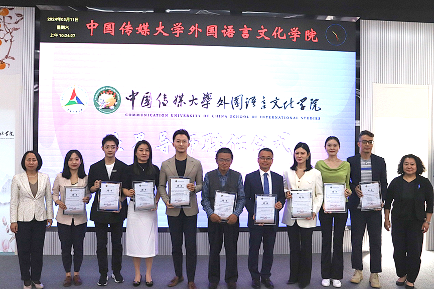 当天还同时举行了中国传媒大学外国语言文化学院业界导师聘任仪式。到场的受聘业界导师共九名,分别是中央广播电视总台银发志愿者、译审林少文,中国社会科学院韩国研究中心研究员朴光海,中央广播电视总台CMG朝鲜语部副主任韩昌松,中央广播电视总台CGTN副制片人、记者曹冰,中央广播电视总台CGTN主持人钟石,新华通讯社记者、编辑洪雁,凤凰卫视主持人安东,北京广播电视台主持人杨若天,妙净雅品牌创始人杨金华。