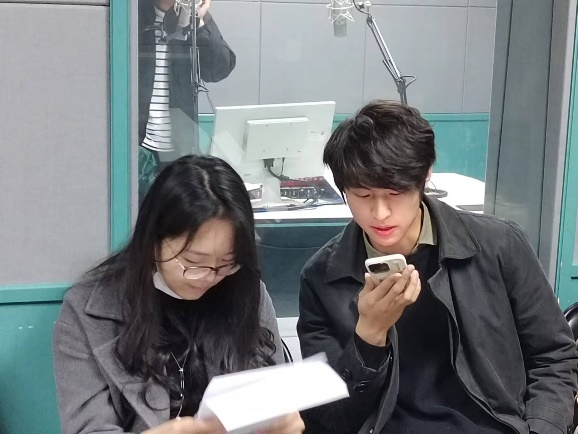 美音组李一鸣和朱星谕在认真录制