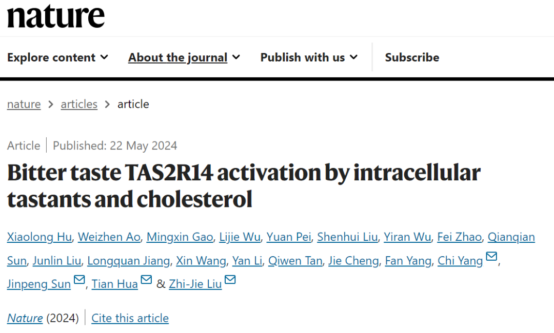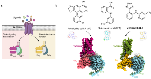 点评 | 裴钢(中国科学院院士)、张旭(中国科学院院士)味觉是生物体的重要生理感觉之一,在营养摄取和规避有害物质中起着至关重要的作用。人类拥有酸、甜、苦、咸、鲜五种基本味觉,这些味觉主要由舌面上的味蕾对不同的味觉分子进行响应。当味觉受体识别到特定的味觉分子时,受体被激活并触发味觉神经信号,该信号传递到大脑味觉中枢,进而产生相应的味觉体验。味觉不仅是一种感觉体验,更是人类生存和适应环境的重要机制之一。除了舌头这一主要味觉感受器官外,味觉受体还广泛分布在胃肠道、呼吸系统、鼻腔等多个组织器官中,发挥着重要的生理药理作用。TAS2R14是人体中表达非常广泛的苦味受体之一,在心脏、胃肠道和呼吸道平滑肌中均有表达。在呼吸道平滑肌中,TAS2R14的激活能起到松弛平滑肌的作用,因此成为治疗哮喘或慢性阻塞性肺病的潜在新靶点。TAS2R14是人体25个苦味受体中识别苦味分子范围最广的受体。既往研究表明,TAS2R14能够识别数百种苦味物质,包括多种临床药物(如氟芬那酸、左氧氟沙星和那可汀)和植物提取物(如马兜铃酸、α-侧柏酮)等。更重要的是,TAS2R14能够识别多种结构各异、不含有特定化学功能团的苦味分子。此外还有研究表明胆固醇也可以调控TAS2R14的功能。由于当前苦味受体的结构信息有限,科学界对TAS2R14的配体识别模式、受体激活机制以及胆固醇调控苦味受体功能的分子机制等仍缺乏深入理解。 2024年5月22日,上海科技大学iHuman研究所、生命科学与技术学院华甜和刘志杰团队,联合山东大学基础医学院孙金鹏团队及上海交通大学医学院第九人民医院杨驰团队在Nature上以“文章加速预览 (Accelerated Article Preview, AAP) ”形式在线发表了题为Bitter taste TAS2R14 activation by intracellular tastants and cholesterol 的最新研究成果,揭示了植物来源苦味物质、上市药物分子及胆固醇对苦味受体TAS2R14的独特调控机制。这也是华甜和刘志杰团队继2022年在Science上报道首个人源苦味受体TAS2R46后,在人体苦味化学感知研究领域的又一次突破。联合研究团队利用单颗粒冷冻电镜技术,获得了人源苦味受体TAS2R14分别与植物来源马兜铃酸A (Aristolochic acid, AA) ,药物分子氟芬那酸 (flufenamic acid, FFA) 和 compound 28.1结合,以及与不同G蛋白偶联状态下的高分辨率结构(图1)。发现TAS2R14中至少存在三个可被不同配体调控的位点,其中AA,FFA和compound 28.1意外地结合在受体胞内跨膜区的口袋2 (pocket-2)中, AA也可以结合在口袋3(pocket-3)中,而胆固醇分子却反客为主地结合在GPCRs经典的正构配体结合口袋内(pocket-1)。此外,受体的第六个跨膜螺旋TM6的胞内端通过自身结构在无序-有序间的构象变化精妙协调配体识别以及不同G蛋白与受体的结合(动画)。这些现象颠覆了人们对GPCR配体识别的传统认知,揭示了苦味受体全新的配体识别和受体激活机制。图1:不同配体调控下的TAS2R14-Gustducin和TAS2R14-Gi1复合物结构。(a) 不同配体调控TAS2R14下游不同信号转导通路的卡通示意图;(b) AA,FFA和compound-28.1小分子的化学结构式,电子密度图以及TAS2R14-Gustducin, TAS2R14-Gi1复合物整体结构密度图。