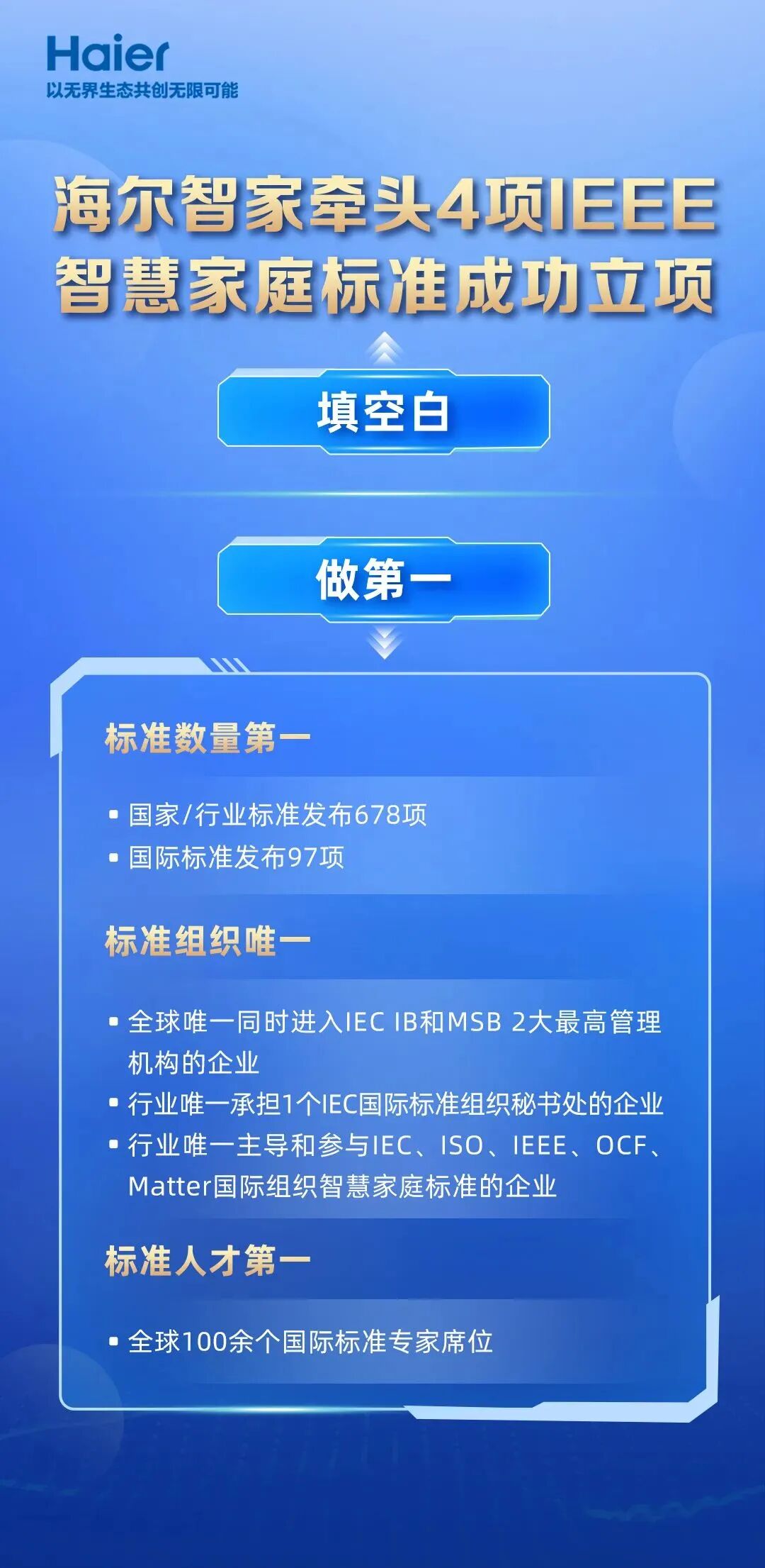 5月16日,海尔智家牵头4项IEEE(电气与电子工程师协会)智慧家庭标准立项,填补了行业在多模态交互系统、智能等级分类与评价模型等方面的标准空白。
