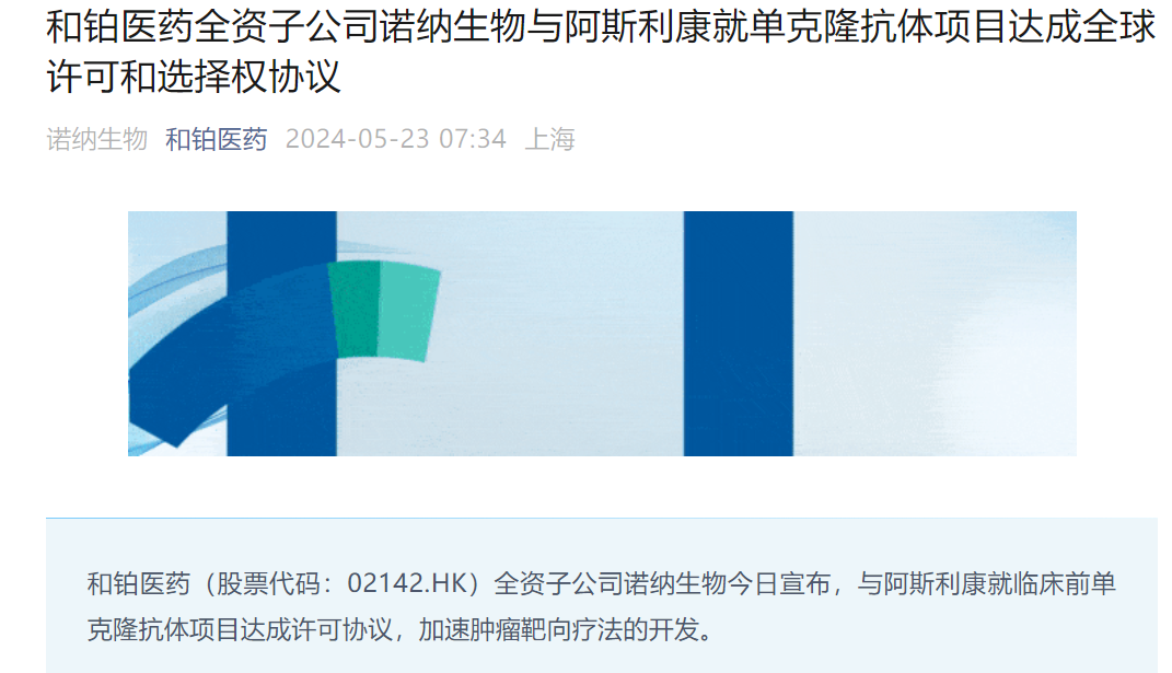 根据协议,诺纳生物将获得1900万美元首付款,并有权获得1000万美元可预期的近期里程碑付款,以及高达5.75亿美元开发、监管及商业里程碑付款和基于净销售额的分级特许权使用费。此外,如果阿斯利康行使选择权,诺纳生物将进一步获得相关付款。这是两家公司达成的第二项交易。