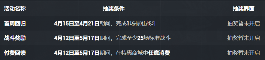 我们额外准备了专属于回归舰长的丰厚回归福利,在您完成造船厂任务时即可轻松完成它们,您可以从下方表格中快速了解任务完成条件,并前往抽奖界面。
