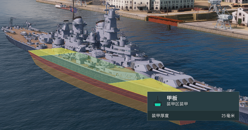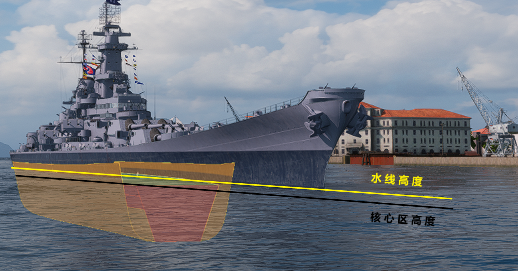 装甲方面,威斯康星虽然看起来是衣阿华船体,但实际上拿到的是伊利诺伊同款潜水核心船体。水下1.52米的核心区高度让威斯康星成为了目前Ⅹ级战列舰中核心最低的选手,再加上收窄的核心区宽度,使得威斯康星的水平核心防护还是相当可靠的。