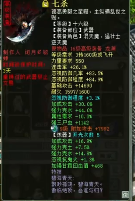 玩家说他这个克水大力魔杀十五星必过,十六星也能杀,属性是变的龙马卡,大家看看属性及装备如何吧?