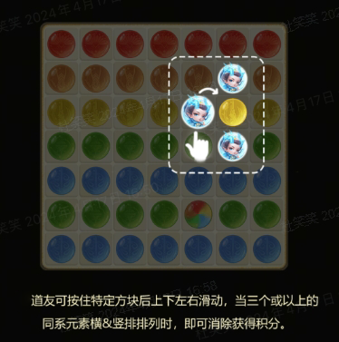 ①点击进入小游戏页面,上下左右挪动珠子,让同类五行珠子凑成并排或并列的3个,即可消除!