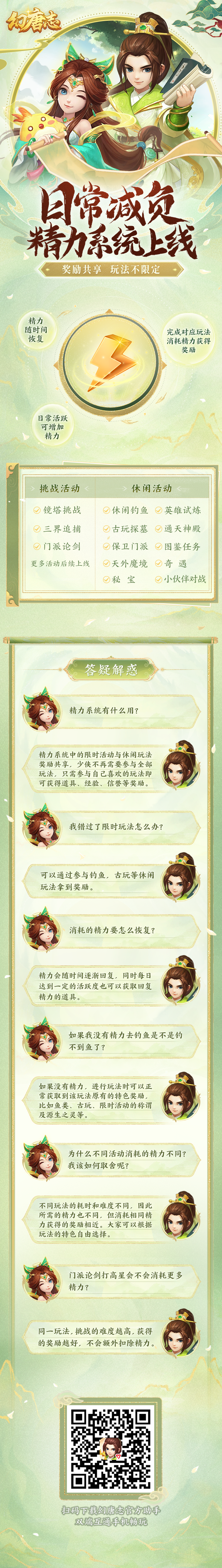 在精力系统中,限时活动与休闲活动奖励共享,少侠们可以选择自己喜欢的玩法来消耗“精力”获得道具、经验、信誉等奖励。无论喜欢门派论剑,还是休闲钓鱼,我们希望少侠每周都能随心参与。也就是说大家不再需要参与全部玩法,时间上安排也会更自由。